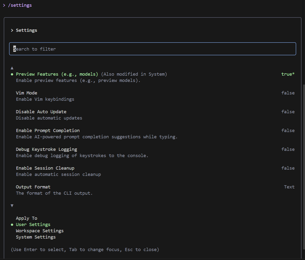 만약 3.0 이상의 모델이 없는 경우 /settings 를 입력하고 preview features를 true로 바꿔주면 된다. 해당 칸으로 들어가서 엔터만 치면 바로 변한다.