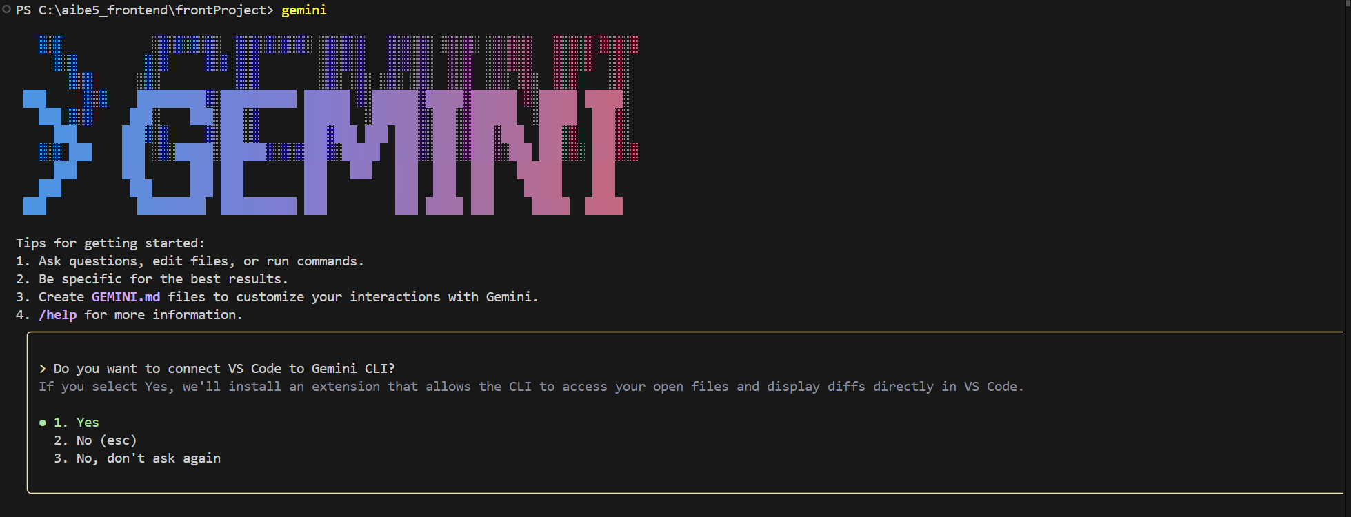 정상적으로 설치됐으면 바로 gemini를 치고 엔터를 누르면 바로 gemini가 실행된다.