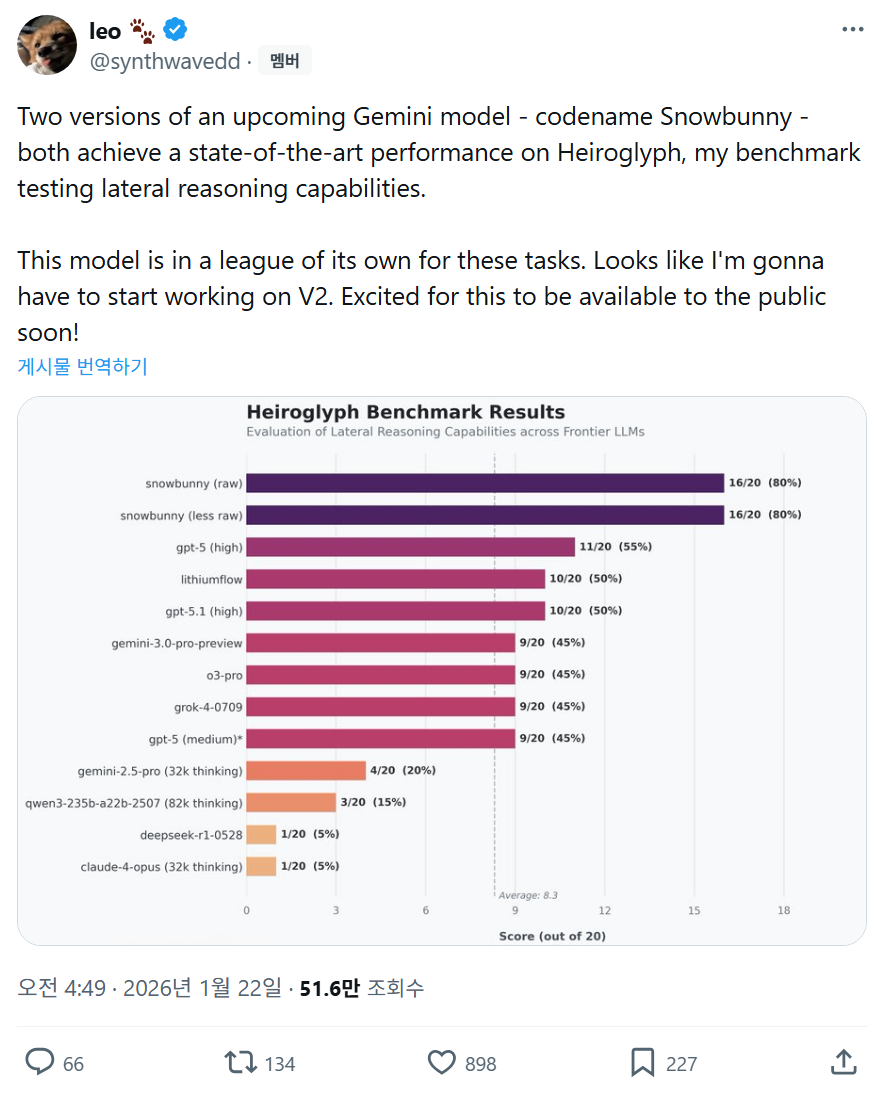 1월 22일, X에서 히에로글리프 벤치마크 운영자 Leo가 구글의 차세대 Gemini 모델 Snowbunny의 벤치마크를 올렸다.