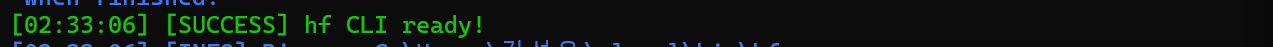 만약 안되면 설치 로그에 나온 전체 경로로 실행을 한다 "C:\Users\{User 이름}\.local\bin\hf.exe" 여기에 본인 pc에서 설치된 경로를 입력하면 된다. 보통 터미널을 재시작하면 주소 대신 hf를 이용하면 된다.