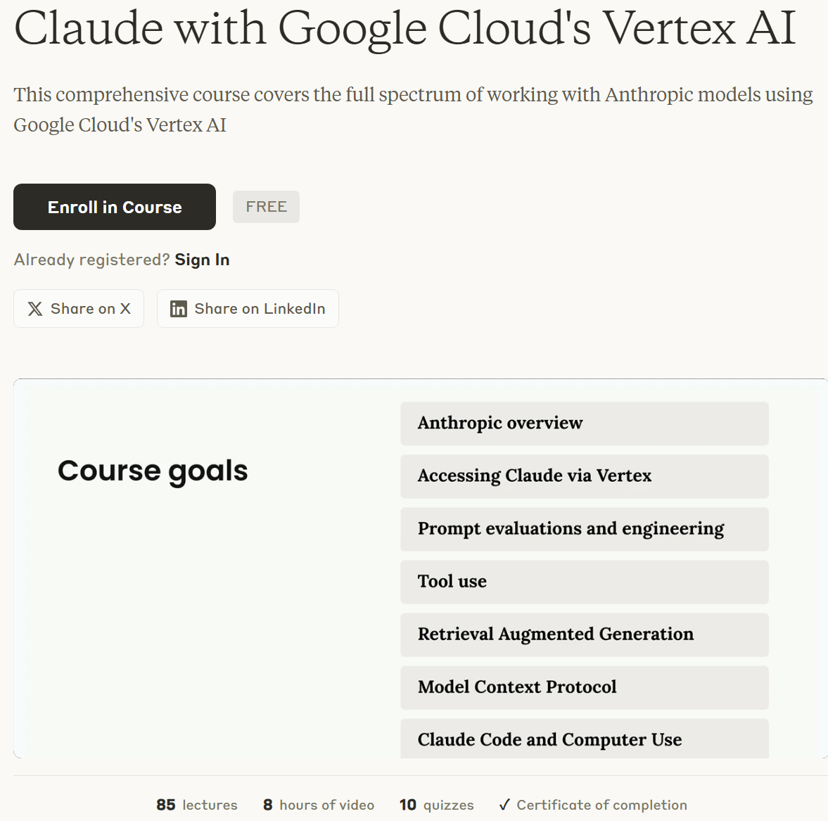 이 과정은 Google Cloud의 Vertex AI 플랫폼을 통한 Claude 모델을 사용하는 것에 대해 다룬다. 스트리밍과 도구 사용 같은 핵심 API 기능을 구현하고, 체계적인 프롬프트 평가 파이프라인을 구축하며, RAG 시스템을 이해하고, 에이전트 아키텍처를 탐구하게 된다. 전제 조건으로는 기본적인 Python 프로그래밍 숙련도, JSON 데이터 처리에 대한 기초 지식, Vertex AI 접근 권한이 있는 Google Cloud 계정이 요구된다.