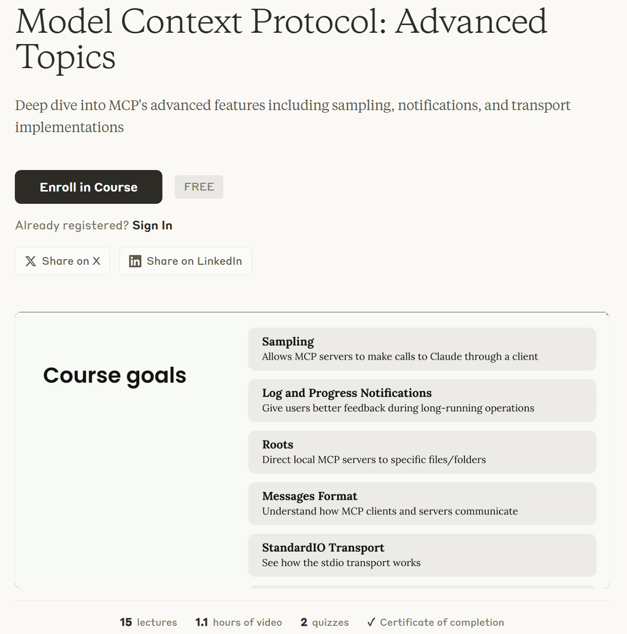 이 과정은 기본적인 메시지 전달부터 프로덕션 배포 전략까지 MCP 서버와 클라이언트의 기술적 구현을 다룬다. MCP가 어떻게 Claude와 같은 언어 모델이 표준화된 프로토콜, 전송, 메시지 형식을 통해 외부 도구 및 데이터 소스와 상호작용할 수 있게 하는지에 대해서 배울 수 있다. 전제조건은 MCP 서버와 클라이언트에 대한 기본적인 이해와 비동기 프로그래밍 패턴에 대한 친숙함이다.