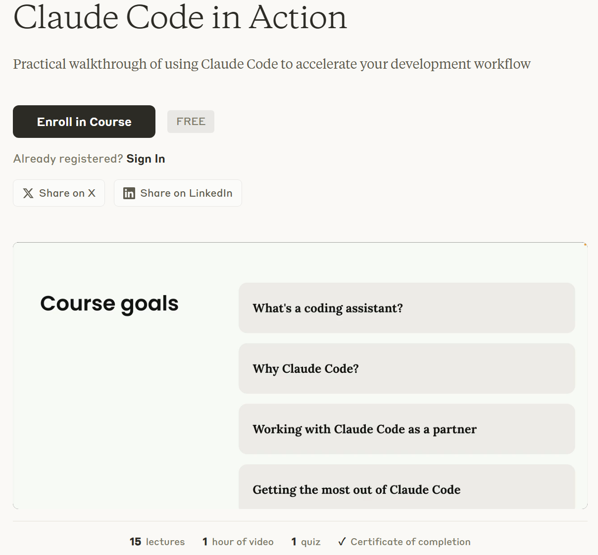 이 과정은 언어 모델을 사용해 개발 작업을 수행하는 명령줄 AI 어시스턴트인 Claude Code를 다룬다. Claude Code가 파일을 읽고, 명령을 실행하며, 도구 시스템을 통해 코드를 수정하는 방법과 함께 컨텍스트 관리, 사용자 정의 워크플로 생성, 후크를 통한 Claude Code 확장, 외부 서비스와의 통합 기법을 배우게 된다. 전제 조건은 명령어 줄(command line)에 대한 기본적인 이해, claude code에 대한 접근 권한 및 API 키이다.