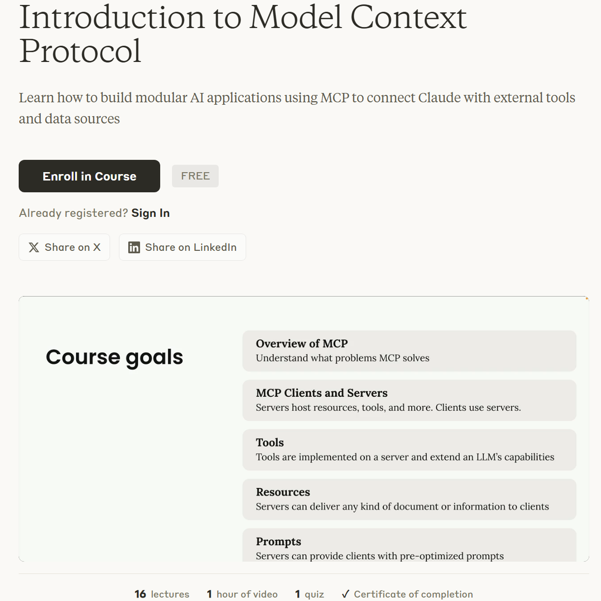 이 과정은 도구 스키마를 수동으로 작성하지 않고도 Claude를 외부 서비스와 데이터 소스에 연결하는 프로토콜인 MCP를 다룬다. 도구, 리소스, 프롬프트를 노출하는 MCP 서버와 이를 사용하는 MCP 클라이언트를 모두 구축하는 방법을 배우게 된다. 이 과정에는 MCP를 사용하여 문서 관리 시스템을 구현하는 실습 프로젝트가 포함되어 있다. 전제 조건은 기본적인 Python 프로그래밍 경험, async/await 패턴에 대한 이해, API 개념에 대한 친숙함 이다.