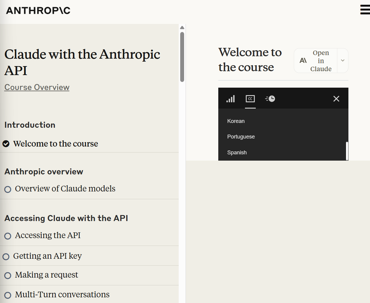 강의 코스를 신청하게 되면 아래와 같은 화면이 뜨며, 자막을 한국어로 설정할 수 있다. 또한 open in claude 기능을 통해 claude로 강의 내용을 정리할 수 있다.