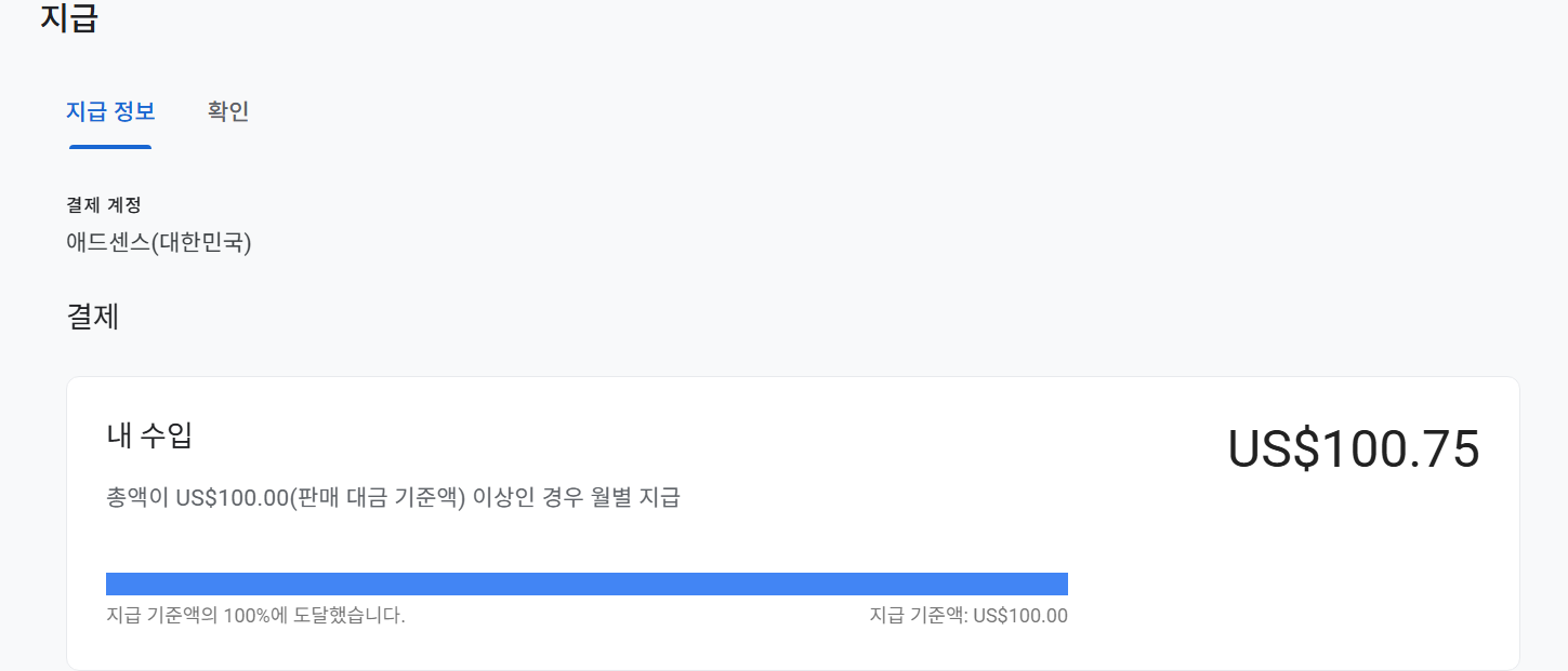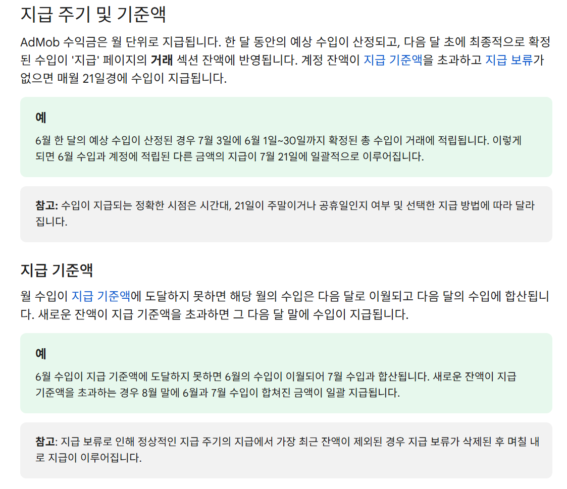 이렇게 본인 확인이 완료된 상태에서 100달러를 넘고 위반한 정책이 없는 경우 매월 21일에 누적 금액이 애드몹/애드센스에 등록한 계좌로 입금된다. 기본적으로 정산 기준이 월 단위이지만 이전 금액이 100달러를 넘지 않은 경우 누적 금액이 모두 지급된다.