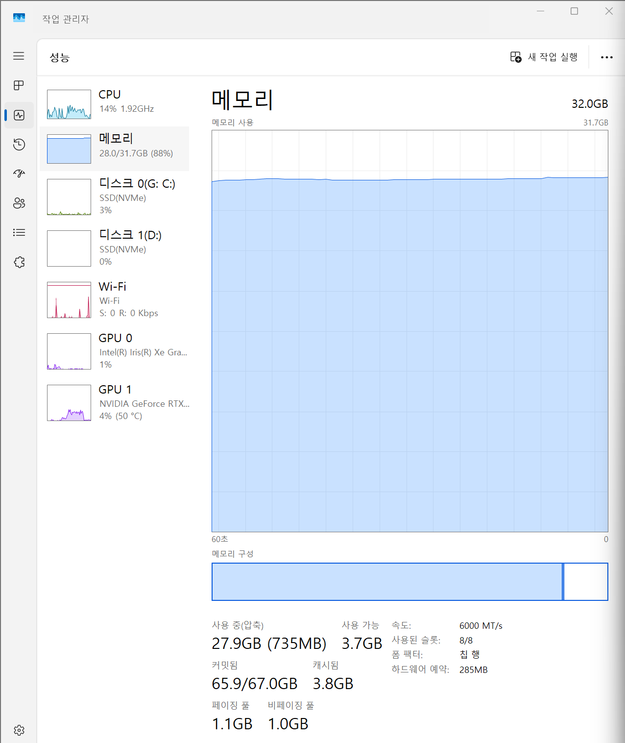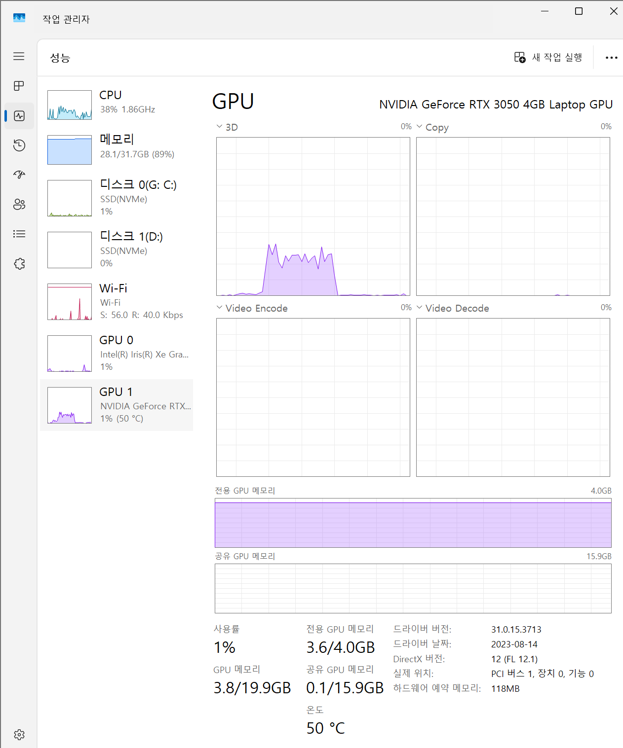 13세대 i7과 vram 4gb짜리 3050, 그리고 32gb의 ram을 장착한 그램 노트북에서 20b 모델을 실행시켰을 때 아래와 같이 노트북 ram과 gpu의 vram 모두 풀로 사용되었고 기초적인 답변을 하는데 대략 10~30초 정도 걸린다.
