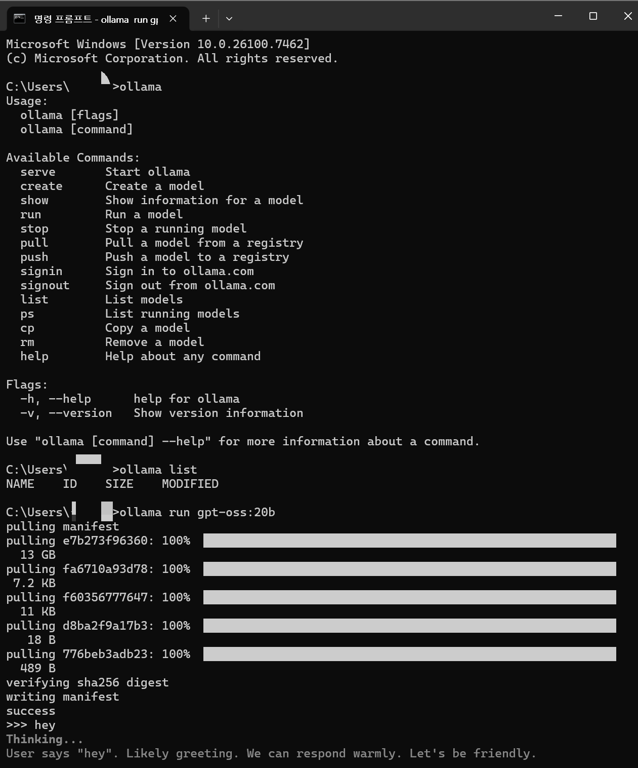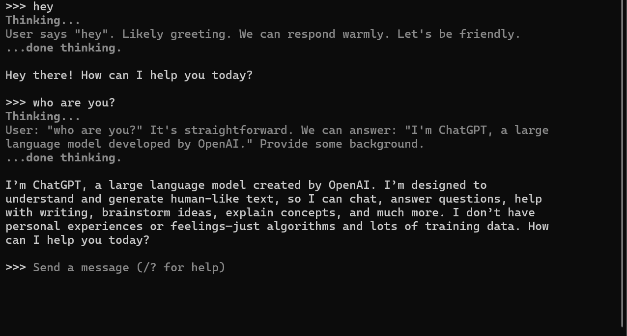 ollama를 다운 받은 경우, 아래와 같이 ollama run gpt-oss:20b 또는 ollama run gpt-oss:120b 로 모델을 다운 받고 실행시키고 대화를 나눌 수 있다. 다운만 받으려면 pull을 사용하면 된다.