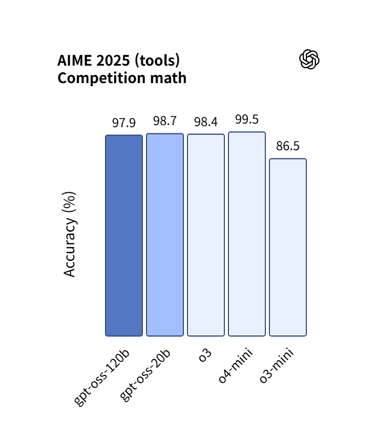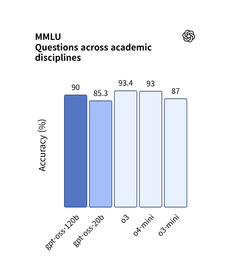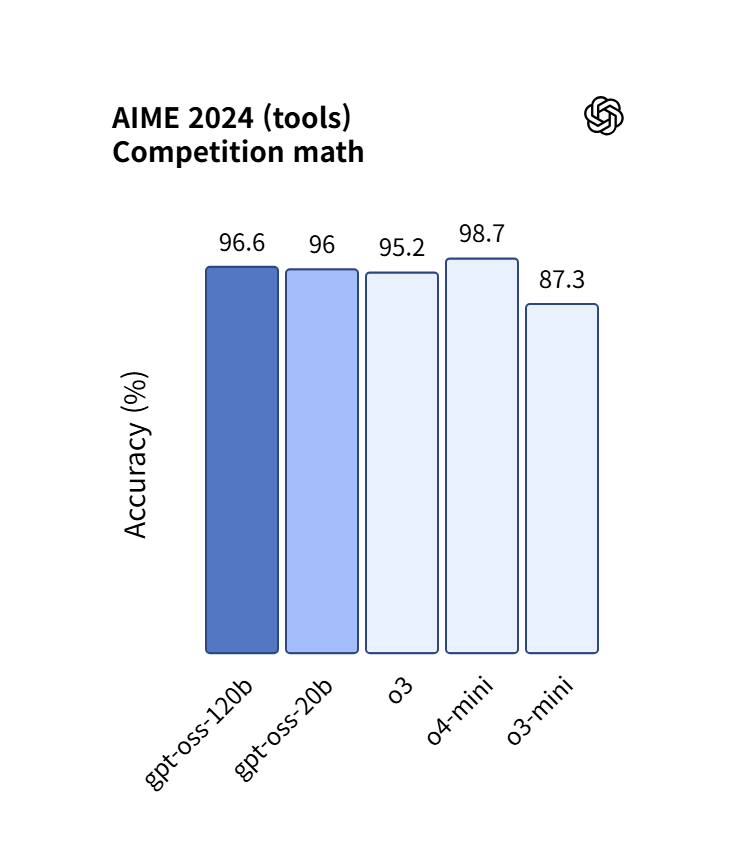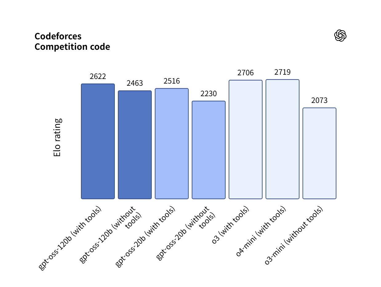 두 모델은 레이턴시와 성능의 균형을 맞추는 세 가지 추론 수준(낮음, 중간, 높음)을 지원한다. 그리고 시스템 메시지에서 문장 하나로 reasoning_effort를 간편하게 설정할 수 있다. gpt-oss-120b는 OpenAI o3‑mini보다 전체적으로 뛰어나고 경쟁 코딩(Codeforces), 일반 문제 해결(MMLU 및 HLE), 도구 호출(TauBench)에서 OpenAI o4-mini와 비슷하거나 더 우수한 성능을 보여준다. 그리고 의료 관련 쿼리(HealthBench)와 경쟁 수학(AIME 2024 & 2025)에서 o4-mini보다 나은 결과를 달성했다. gpt-oss-20b는 동일한 평가에서 OpenAI o3‑mini와 비슷하거나 더 나은 결과를 달성했고 경쟁 수학과 의료에서는 더 뛰어난 성능을 보여주었다. 더 자세한 지표는 아래와 같다(공식 페이지 지표).