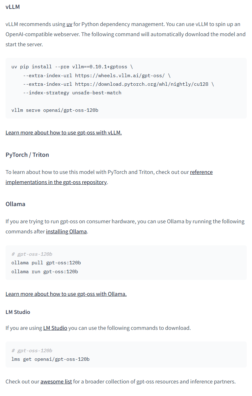 아무래도 일반 노트북에서 사용하기에는 상당히 버거워보인다. 20b 모델을 사용하려면 확실히 vram 16기가 이상의 gpu를 사용하는 게 좋을 것 같고 120b 모델은 최소한 a6000 이상의 gpu를 사용해야할 것 같다. 돈이 부족하고 속도가 느려도 상관없는 경우엔 통합 메모리를 사용하는 미니 pc 도 대안이 될 것 같다.