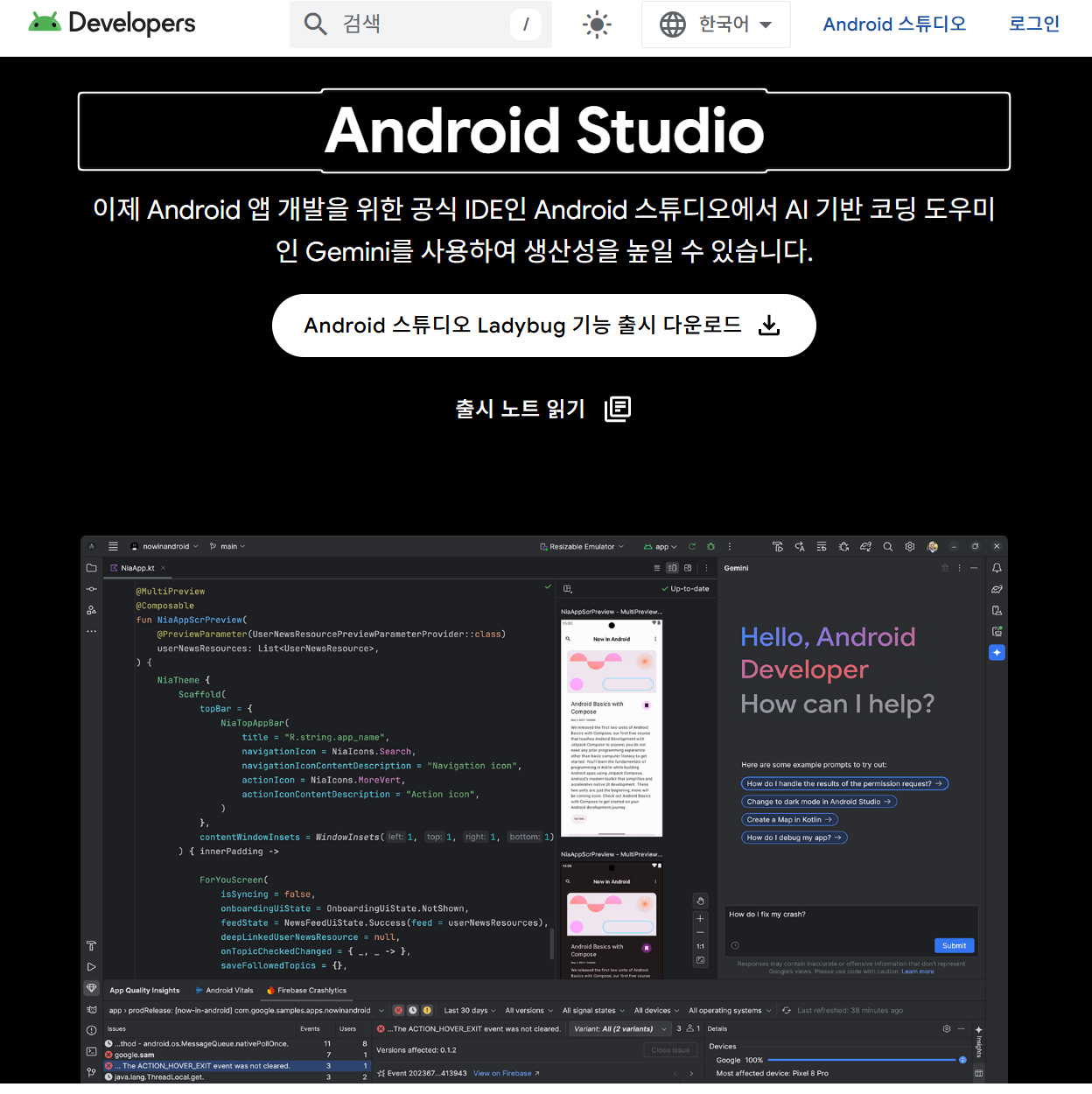 jetpack compose 와 최근 업데이트된 여러 정보들을 기준으로 다시 안드로이드 개발을 총정리할 필요성을 느껴 겨울 방학 동안 강의를 들으면서 공부를 했다. 공부한 내용들을 따로 정리하는 게 좋을 것 같아 강의를 들으면서 공부한 내용을 정리해보았다. 참고로 총 15강(15일차)까지 있다. 1. 개발 환경 및 도구 1.1. 안드로이드 스튜디오(Android Studio)안드로이드 스튜디오는 안드로이드 앱 개발을 편리하게 할 수 있도록 만든 통합 개발 환경 (IDE) 이다. 아래의 공식 링크를 통해 안드로이드 스튜디오를 다운 받으면 일반적으로 Android Studio 설치 마법사가 최신 버전의 안드로이드 SDK도 같이 다운 받도록 안내한다.Android Studio Flamingo(2022.3) 이..