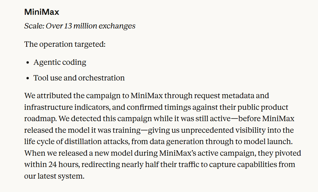 1주 전 쯤에 흥미로운 기사를 봤다. 중국의 AI 기업에서 모델을 학습시킨 방식이 미국의 고성능 모델들의 응답을 활용한 지식 증류 기법이라는 내용의 기사였다. Anthropic에서는 중국의 DeepSeek, Moonshot, MiniMax 가 가짜 계정 2만 4천개를 활용해 클로드를 대상으로 대규모 증류 공격을 했다고 한다. 특히 minimax의 경우 1300만회의 증류 공격을 했다고 한다. 대화당 10~25K 토큰이 사용되었다고 가정할 때 총 약 1,500억~4,000억 개의 토큰이 추출된 것으로 추정되는데 이정도면 파인튜닝에 필요한 양을 아득히 넘어서 아마 메인 모델 사전학습에 사용되지 않았을까 싶다.https://www.finance-scope.com/article/view/scp202602240..